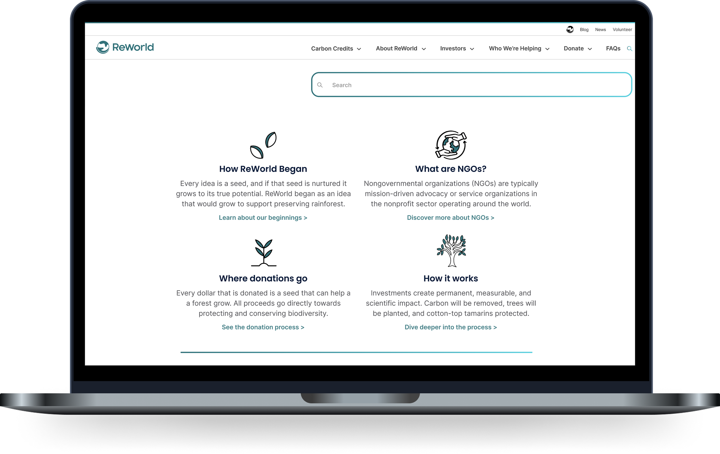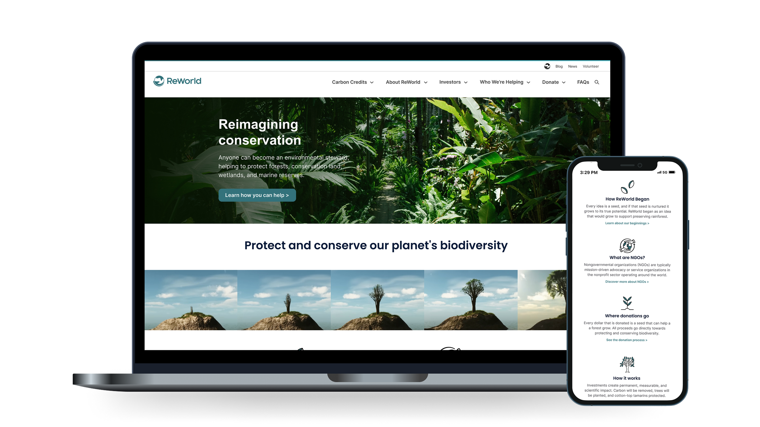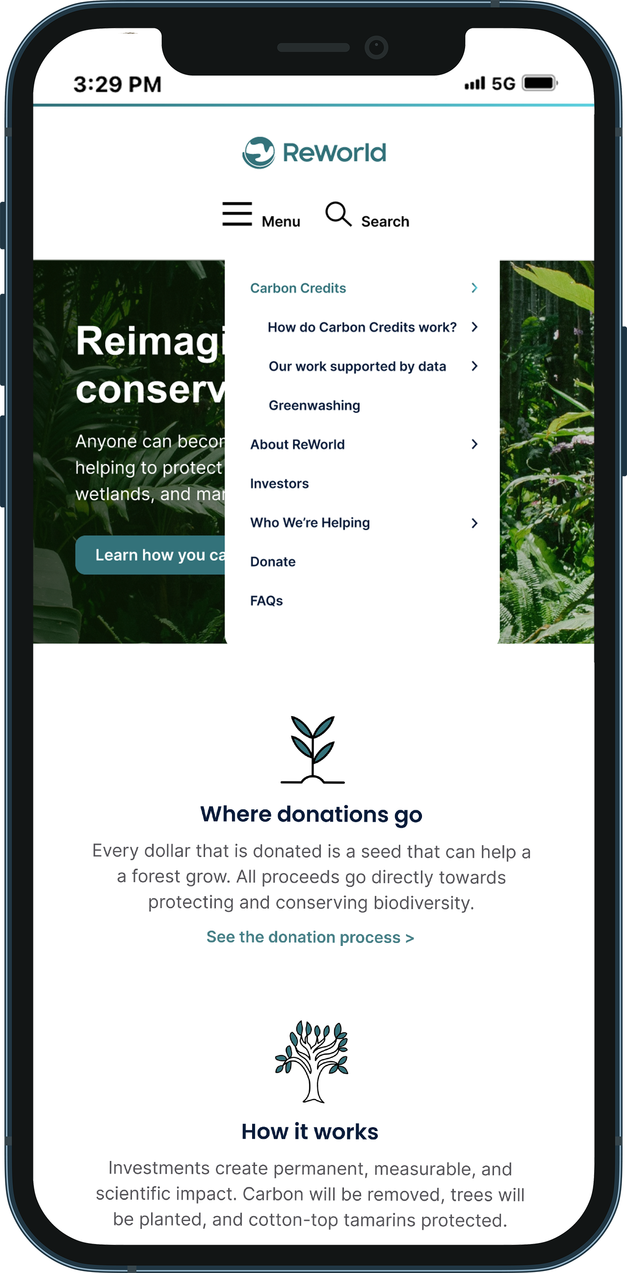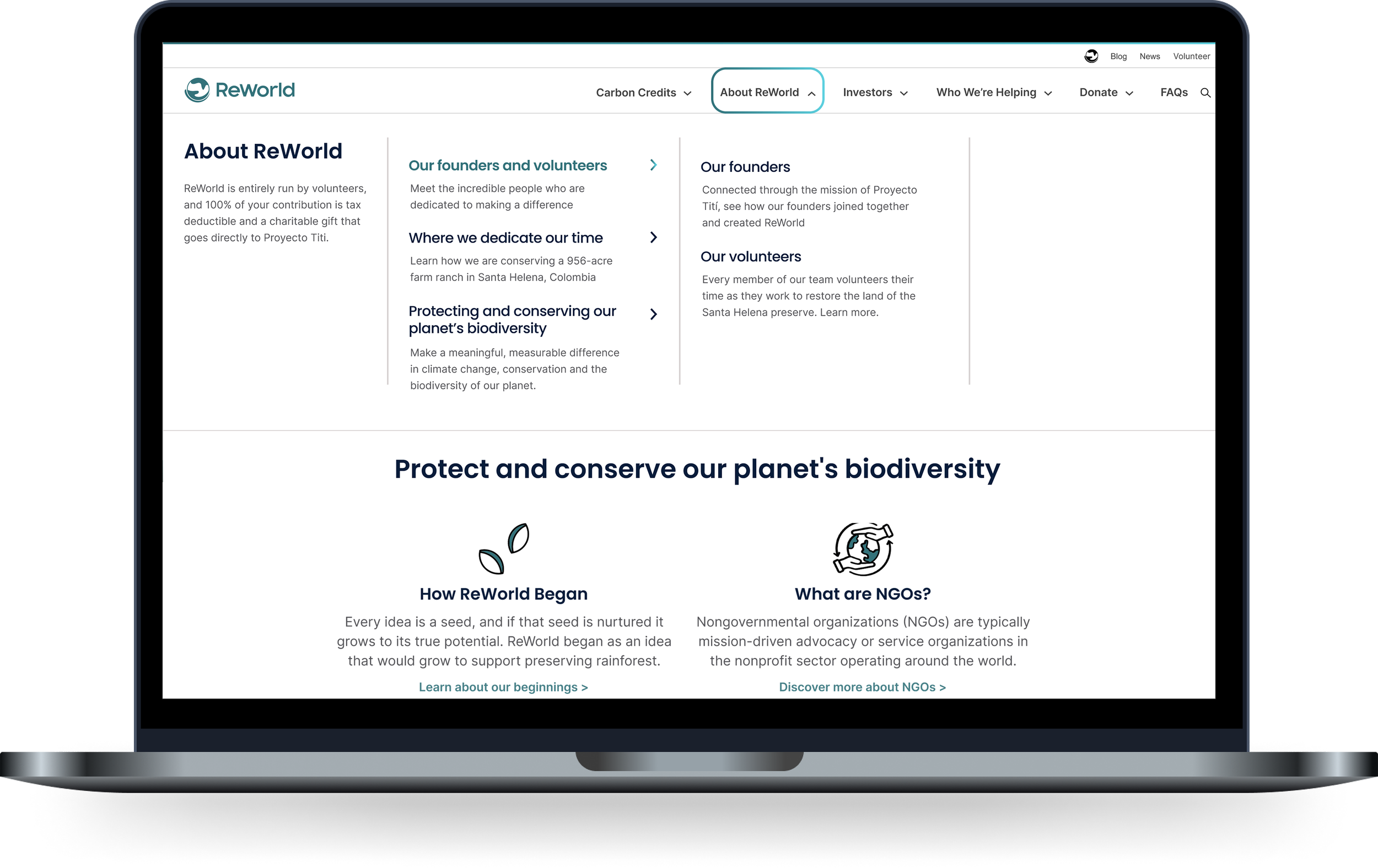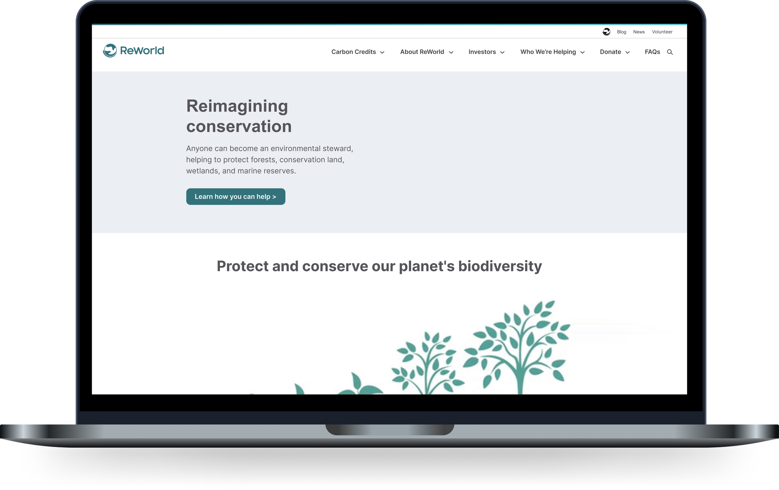 The main focus is to redesign the homepage to clearly convey ReWorld’s new carbon offset message and illustrate how it provides a pathway for companies to reduce their carbon footprint.