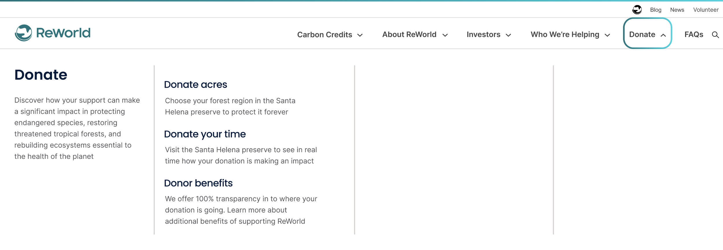 The current donation call-to-action directs visitors offsite to the Stripe donation platform, which raised concerns among users. Stripe automatically sent a verification code to their phones even if they weren’t logged into the platform, and it only accepted credit card payments, lacking options for more secure methods like PayPal or Venmo. To enhance user experience, consolidating all donation-related sections—such as "Donate Acres," "Donor Benefits," and "Donation Platform"—into a unified navigation and sub-navigation structure would significantly improve accessibility and coherence.